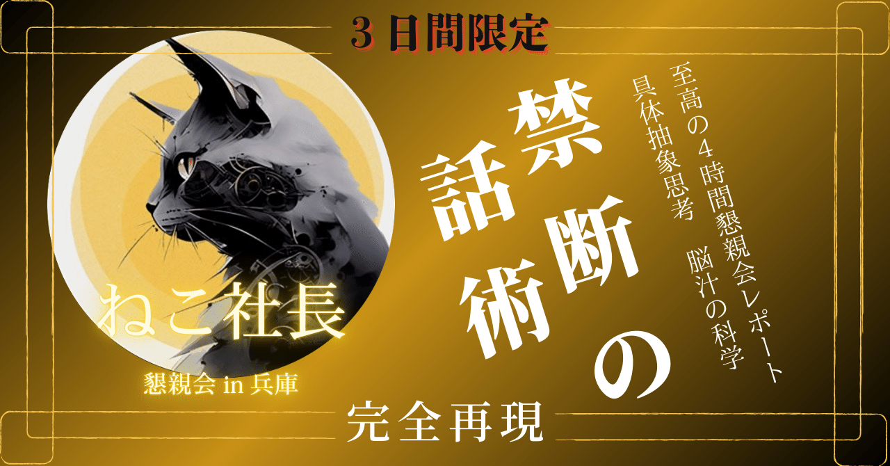 こんにちは。 Dです。 このnoteは、 2024年9月8日に兵庫県、三宮で行われた懇親会を再現したまとめです。 ねこ社長の動画は2、3時間で数万円で販売されているものが多くあ…